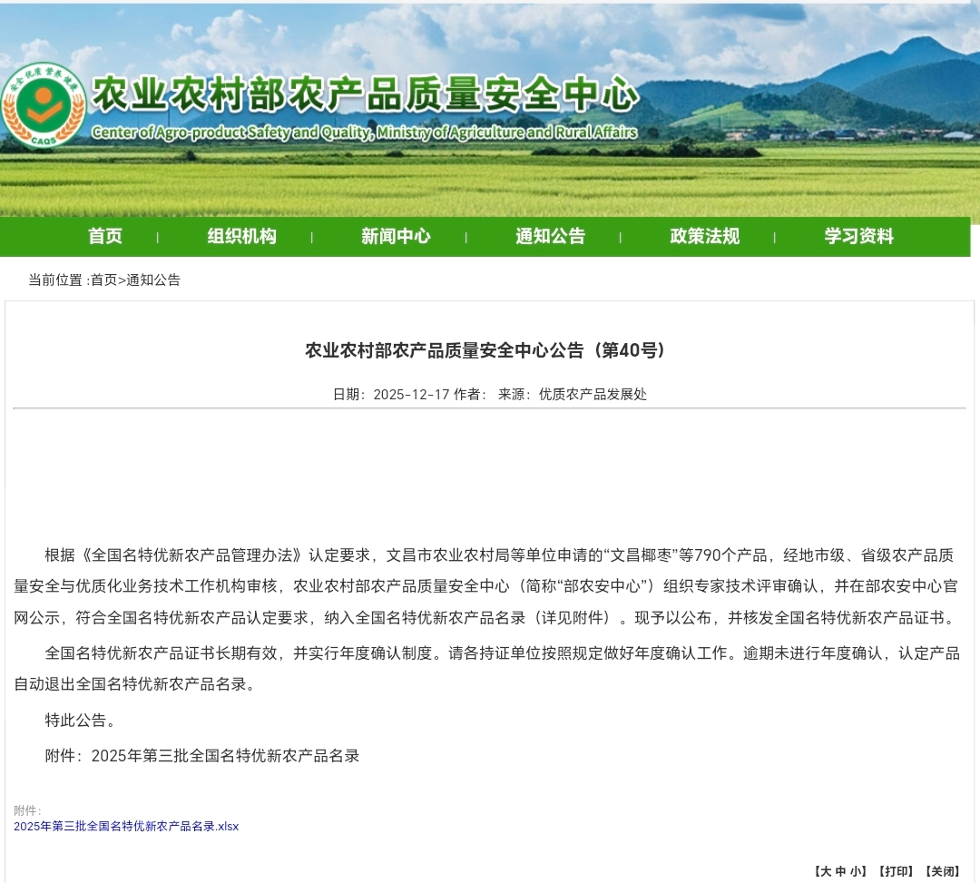 根据《全国名特优新农产品管理办法》认定要求,经地市级、省级农产品质量安全与优质化业务技术工作机构审核,农业农村部农产品质量安全中心(简称“部农安中心”)组织专家技术评审确认,并在部农安中心官网公示,符合全国名特优新农产品认定要求,纳入全国名特优新农产品名录。其中,我市“贵港富硒小龙虾”、“覃塘莲藕”、“六陈玉桂”、“平南泉水鱼”、“社坡腐竹”、“桂平山泉草鱼”等6个产品入选2025年第三批全国名特优新农产品名录。