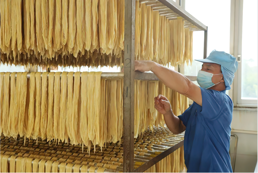 社坡腐竹主产区所属乡镇地处北回归线附近,亚热带季风气候,光照充足,年平均日照1700小时,雨量充沛(年平均降雨量1726.7mm)相对湿度80%,既利于大豆(非转基因品种)生长,又适合腐竹制作过程中对温度、湿度的要求,自然晾晒干燥率高,腐竹色泽明亮、软硬适中。此外,桂平市以农业为主,工业污染少,空气、水源洁净,有效提升腐竹的制作环境,蒸煮的豆浆口感、安全性更强,为腐竹生产提供了“无添加”环境。社坡腐竹原材料选用社坡本地或东北产的优质非转基因黄豆,颗粒饱满,蛋白质含量高。社坡腐竹制作主要由精选黄豆、浸泡、磨浆、滤浆、煮浆、挑皮、晾晒、定型等独特加工工艺而成,其中浸泡黄豆的水源、煮浆的火候、“挑皮”和烘干(晾晒)为核心环节,造就社坡腐竹异常筋道、耐煮、有嚼劲的独特口感。