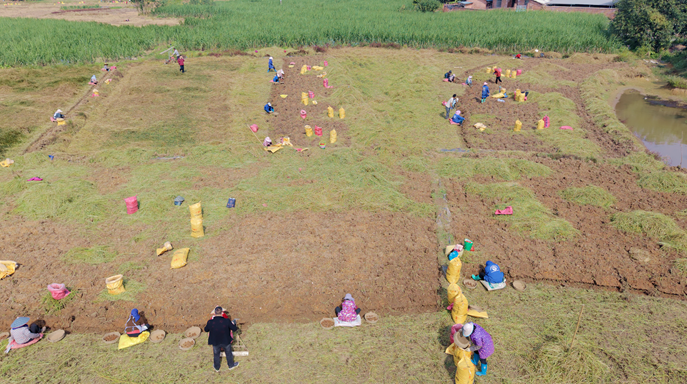 基地承包户、负责人黄运贵不仅带动周边20多名村民就近就业,还主动分享种植技术,成功带动多户农户发展马蹄种植,帮助大家拓宽增收渠道。他一边查看采收情况,一边向记者介绍:“我们在这里种了100多亩马蹄,已经采收20多天了,目前进度过半,预计总产量能达到100万斤左右。”泥土中,一个个饱满圆润的马蹄显露出来。随手拾起一个擦拭干净,栗色表皮泛着细腻光泽,咬上一口,清脆多汁、清甜回甘,满口都是丰收的滋味。