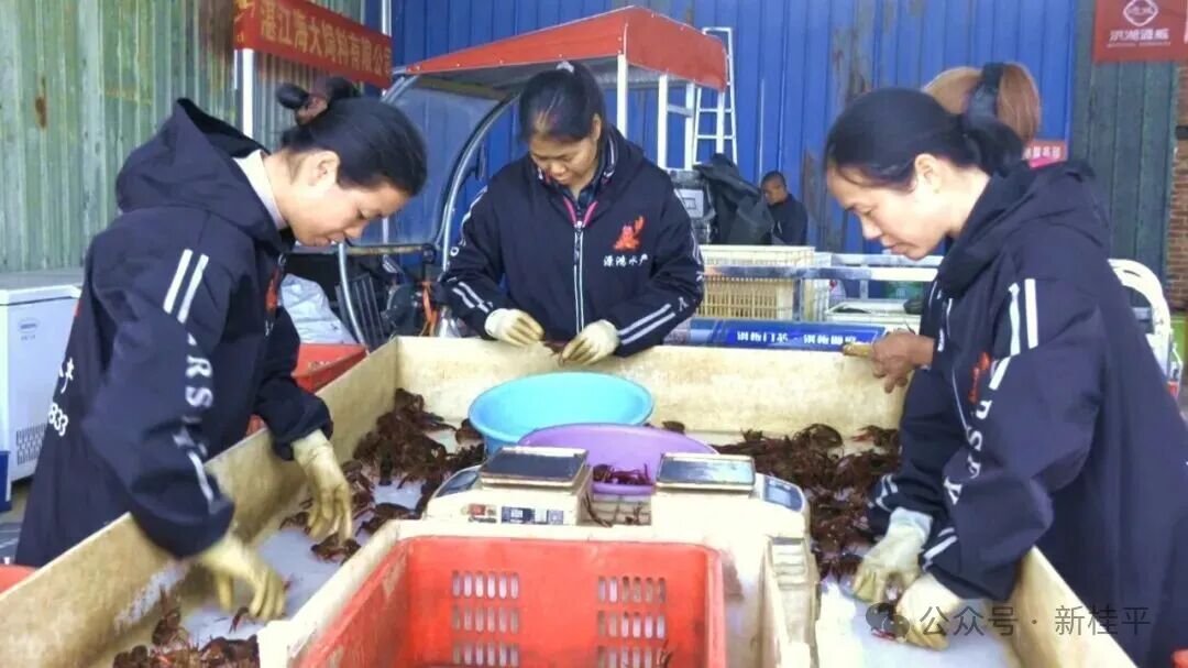 小龙虾集散中心石头收购点也是一派繁忙景象,各地运来的虾苗和成品虾陆续抵达,工人们分工明确,有条不紊地开展卸车、分拣、称重、打包工作。这些带着桂平生态印记的小龙虾,即将通过物流网络发往全国各地市场。