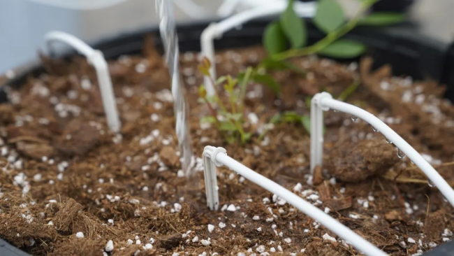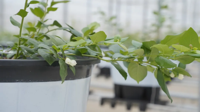 在现场,记者看到,这里的蓝莓苗并未种植在土壤中,而是“住”进了装满椰糠、泥炭的独立花盆,每盆都插着细细的白色管道。“我们的滴灌系统可以用手机远程操作,每天需要多少肥料,就打进多少肥料。”毕磊说,这套水肥一体化系统能根据蓝莓生长需求,实时精准供给水分和养分,既节约资源,又能保障苗木长势。