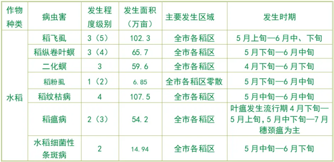 1.稻纵卷叶螟、稻飞虱:冬后调查发现有一定的虫源,结合往年情况,5~6月,我市多为雨水天气,雨量大,易导致外地虫源大量迁入。