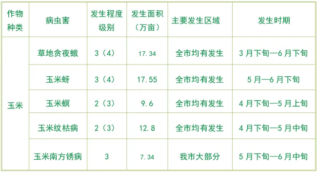 8.玉米害虫:一是草地贪夜蛾在冬种玉米上有一定的虫源基数,加上桥梁玉米地偏多,有利于该虫的繁殖为害,本地为适生区,西南地区虫口密度大,虫源基数高,会随西南季风迁入本地。二是玉米螟、蚜虫、纹枯病、大斑病及锈病为常发性病虫害,有一定的病虫源基数。