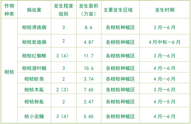 根据病虫害冬后田间调查结果,参考贵港市中长期气象预测及综合当前农业生产进度、品种布局等因素进行分析,主要病虫害有稻飞虱、稻纵卷叶螟、二化螟、稻瘟病、稻纹枯病、草地贪夜蛾、柑橘红蜘蛛、柑橘木虱、荔枝霜疫霉病等,预计我市今年上半年农作物病虫害总体发生趋势为中等(局部中等偏重)发生。