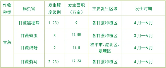 9.甘蔗病虫害:宿根蔗面积大,长年连作;甘蔗中后期防治难度大等因素致使虫源积累。甘蔗蓟马因上年天气干旱,虫源基数大。