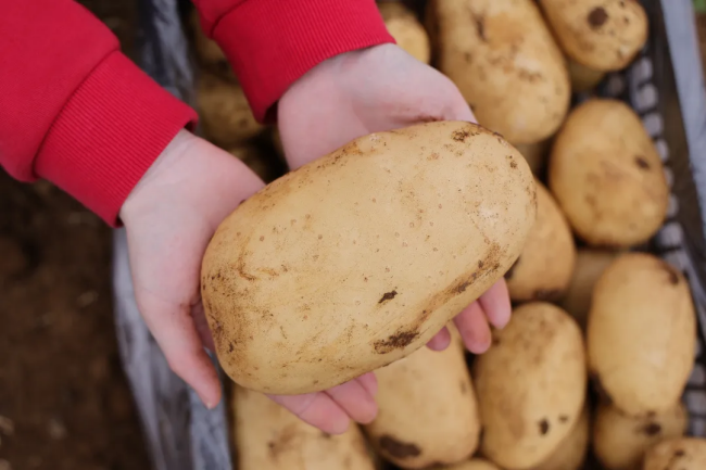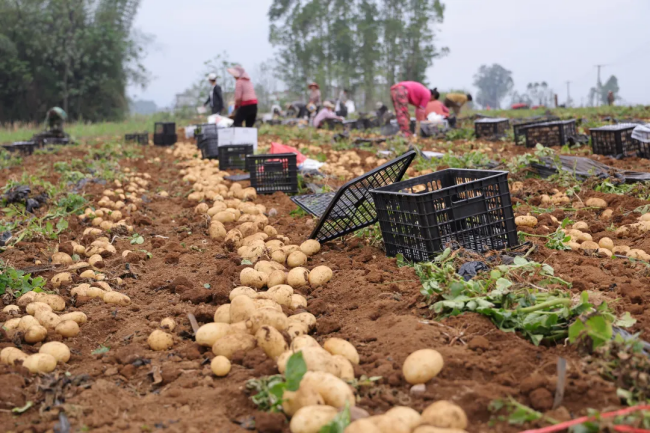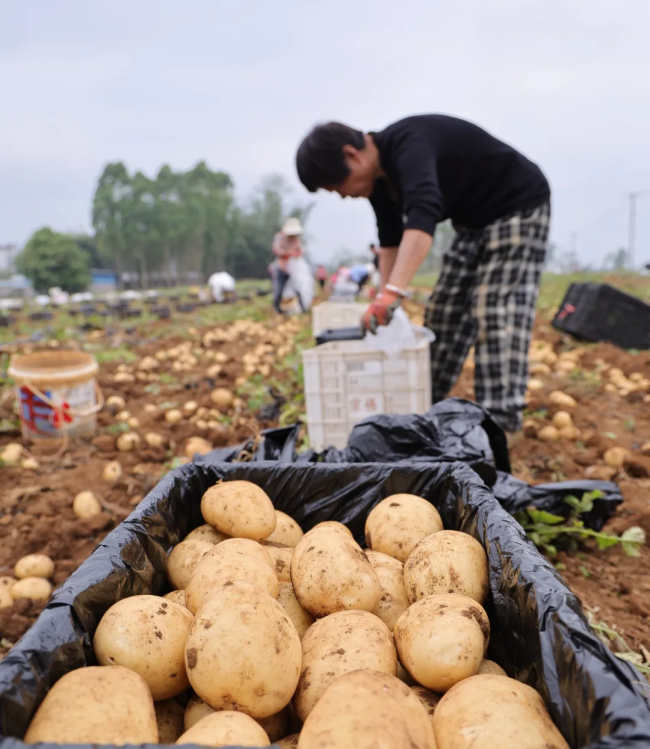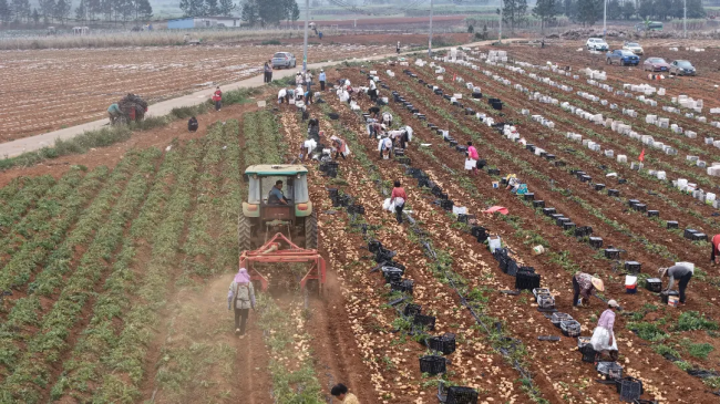 走进该基地,连片田地绿意渐退、薯香四溢。伴随着机械采收的轰鸣声,圆润饱满的马铃薯被源源不断翻出土面,30多名工人分散在田间,弯腰捡拾、分拣装袋、搬运上车,动作娴熟配合默契,丰收的喜悦洋溢在每个人的脸上。