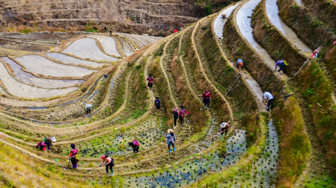 近日,走进龙胜各族自治县龙脊镇中六村下埠屯,只见层层梯田间一派热火朝天的劳动景象。虽时值寒冬,村民们却丝毫未减劳动热情,除草、挖田、砌崩、耙田、扶田基,各项农活有条不紊,梯田之上涌动着蓬勃生机。