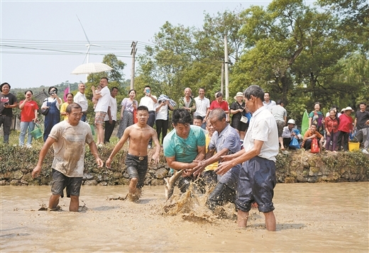 灵田镇长岗岭村举办“浑水摸鱼”民俗活动,吸引了众多游客。