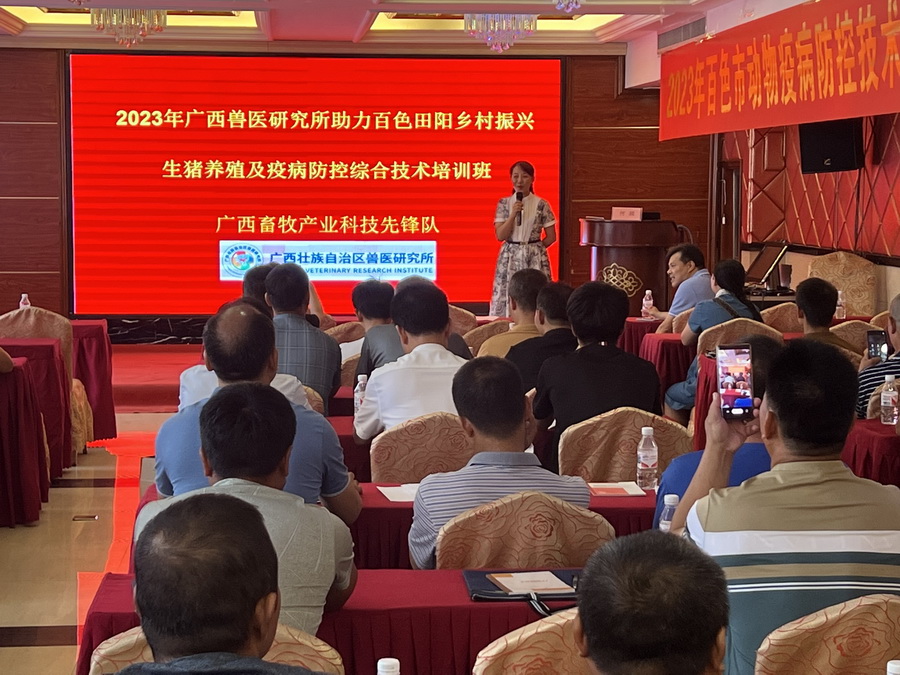 8月3日,畜牧产业科技先锋队在田阳区开办生猪养殖及疫病防控综合技术培训班。当地生猪养殖业主、乡镇水产畜牧兽医站、动物防疫技术服务专业合作社及动物疫病预防控制中心有关人员共计110多人参加培训。授课专家针对广西当前重要猪疫病流行特点、中小规模猪场防控非洲猪瘟的要点、疫病综合防控措施等方面知识进行讲解,灌输生猪养殖及疫病防控的科学理念,为助力乡村生猪产业振兴服务提供有力的技术支撑。