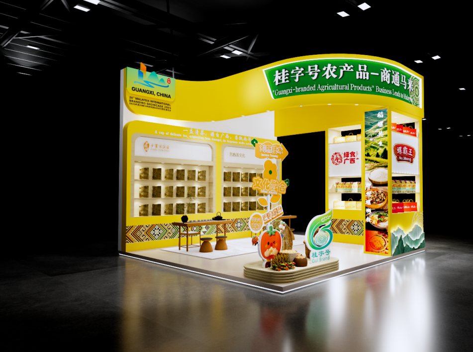 广西展团位于展位号2F01-02及2F11-12,以36平米特装展位打造“桂字号农产品商通马来”主题展区。展位采用“金黄+绿色”主色调,金黄象征丰收硕果与热带风情,绿色代表生态可持续发展。现场将通过实物品鉴、图文展示、茶艺表演等互动形式,全方位呈现广西农产品的特色与品质。展品涵盖荔浦芋系列、螺蛳粉系列、六堡茶系列等王牌品类,以及罗汉果、柿饼、木薯产品、马蹄罐头、紫黑香糯等特色产品,全面展示从传统名优特产到现代方便食品的完整产业链条。