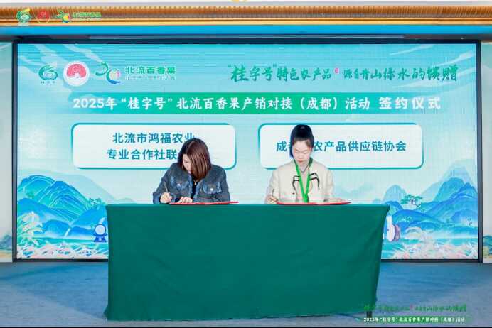 产销对接签约仪式环节,两组企业达成合作共识。其中,广西东云农业投资有限公司与成都哈妮食品饮料有限公司、北流市鸿福农业专业合作社联合社与成都市农产品供应链协会分别签署意向合作协议,签约金额达4000万元,标志着北流百香果正式开启西南市场深耕之旅。