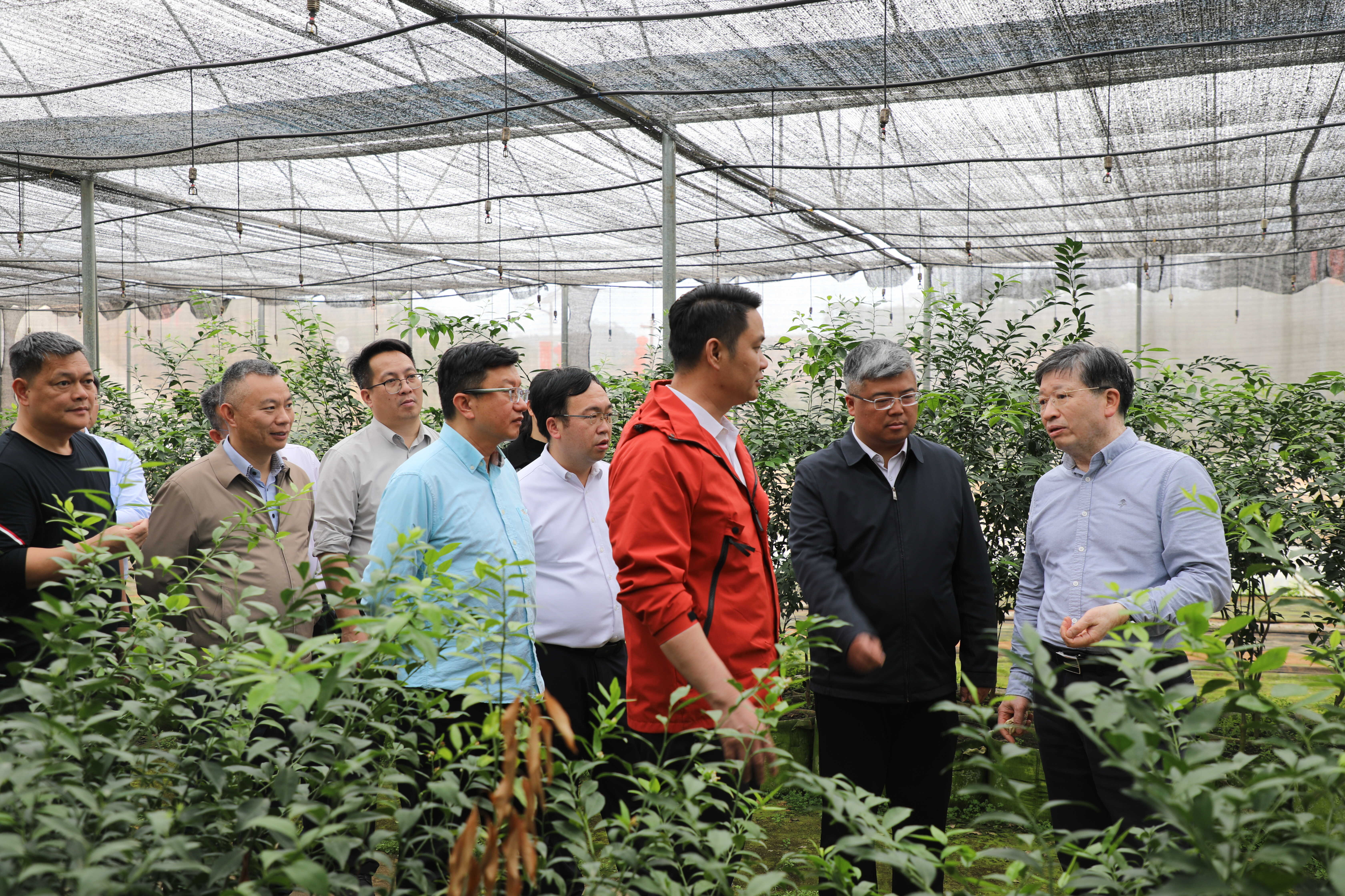 2月12日下午,邓秀新副院长(右一)在钦州市浦北县无病毒苗木繁育基地调研,自治区农业农村厅副厅长韦波(左五)、钦州市副市长王文泽(右二)陪同调研。