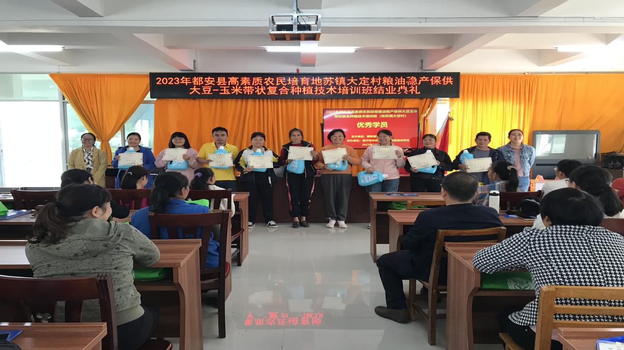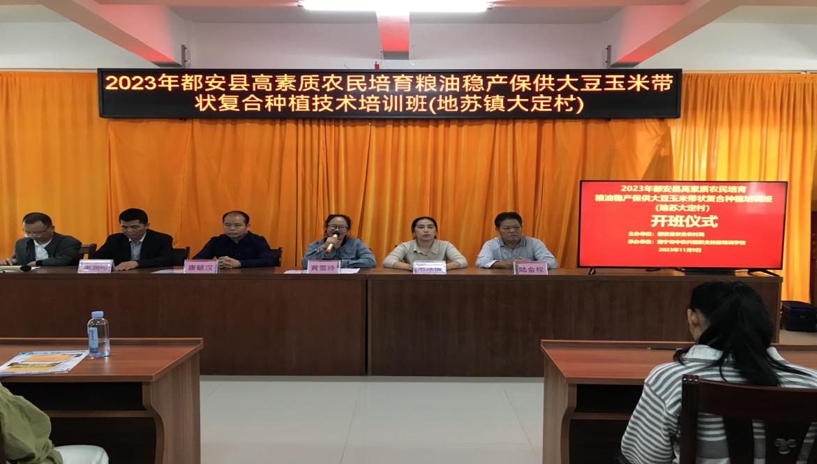 2023年11月23日都安瑶族自治县农业农村局联合南宁市中农兴桂职业技能培训学校在地苏镇大定村举办的高素质农民培育粮油稳产保供大豆玉米带状复合种植技术培训班圆满落幕。