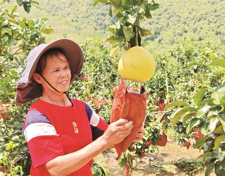 在红心猕猴桃种植园,果实挂满藤蔓,工人们有序地采摘、分拣、称重、装箱。山野葡萄种植园中,一串串紫黑透亮的果实缀满枝头,果香四溢。红心蜜柚种植户同样忙碌,金黄饱满的蜜柚压弯了树枝,果农脸上写满笑意(如图)。“我种有红心蜜柚80多亩,去年收入11万元左右,今年预计比去年增收5万多元。”农户韦仁仙表示。