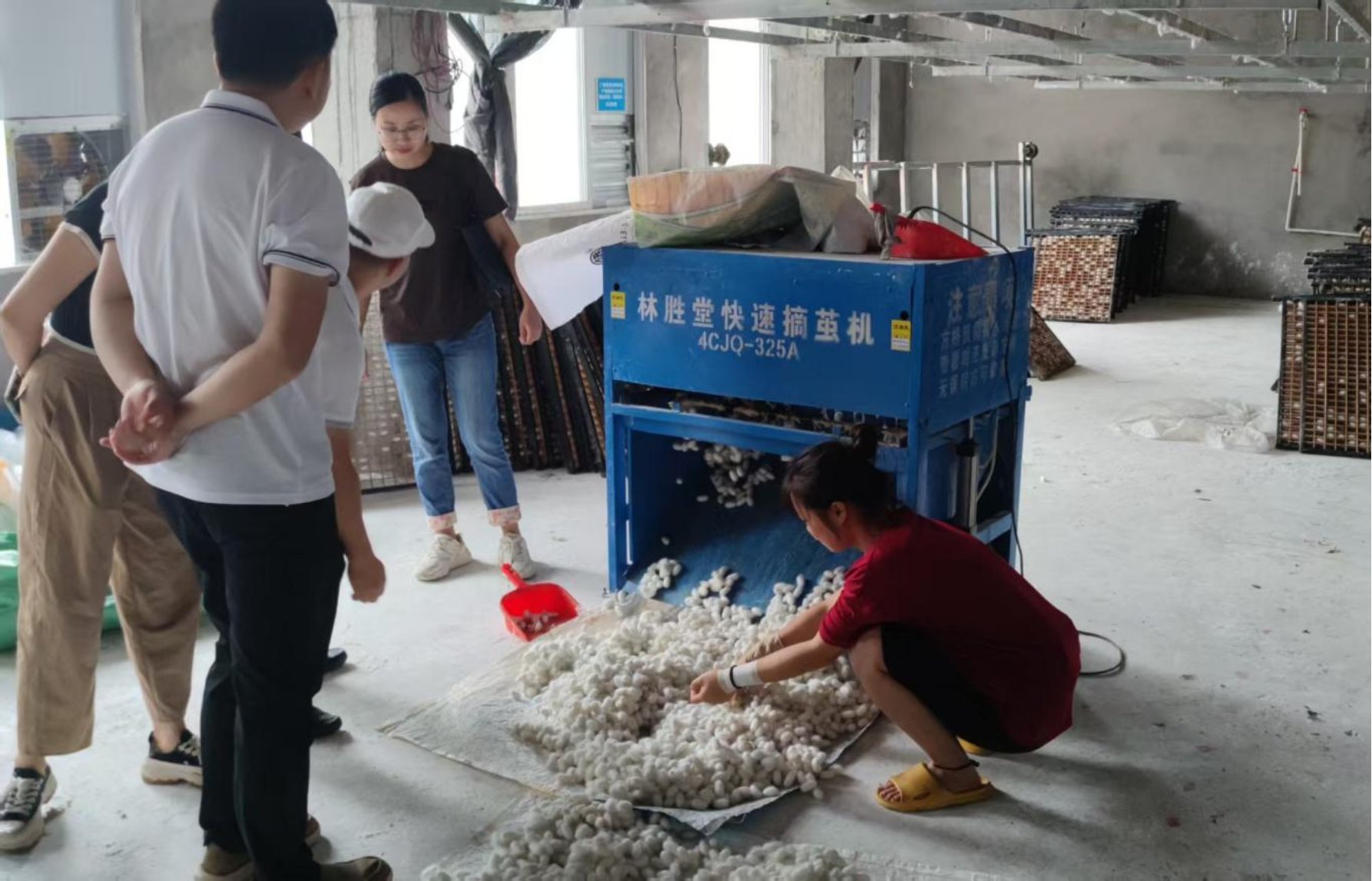 行业专家现场查看广西林胜堂蚕具有限公司快速摘茧机使用情况