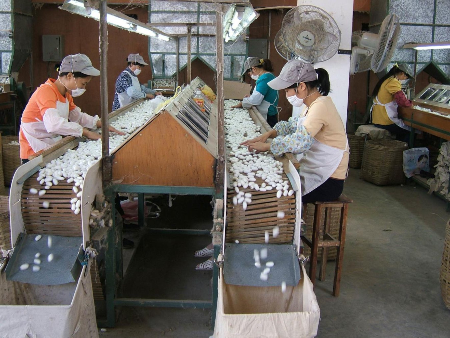 图为河池市东方丝路丝绸责任公司选茧车间生产场景。