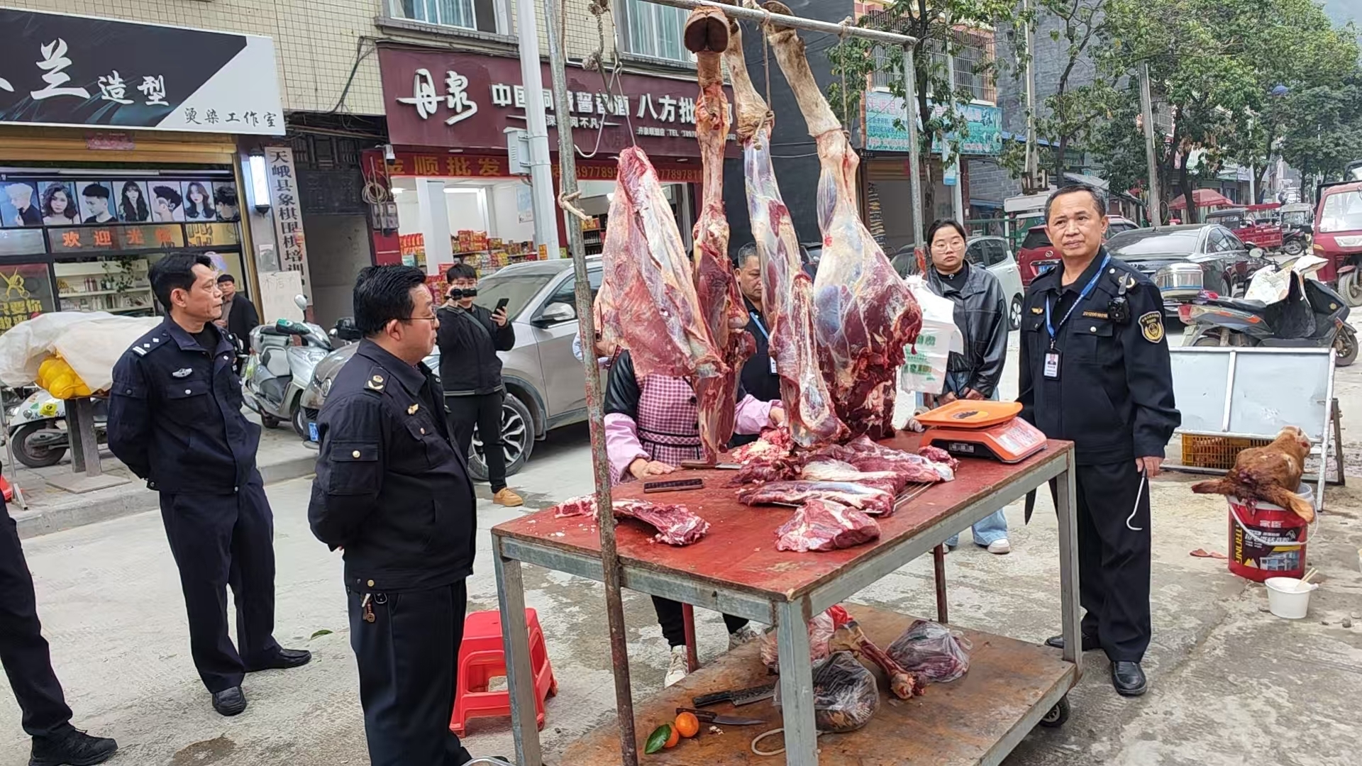 检查中,联合执法组查获一摊主未集中屠宰并未将由官方兽医检疫的牛肉拿到汉军市场对面的路边摆摊销售,在塘英市场及周边查获三户未集中屠宰和未经检疫的三户猪肉,依据《中华人民共和国动物防疫法》和《生猪屠宰管理条例》,农业执法人员立即将他们还未销售的肉品进行查封扣押;城市管理执法人员也将在检查中占道摆摊的设施也进行查封暂扣。此次行动有效规范了节日期间食品市场经营秩序,及时消除了一批食品安全风险隐患,为群众饮食安全筑牢防护网。