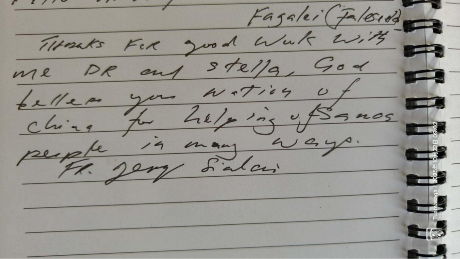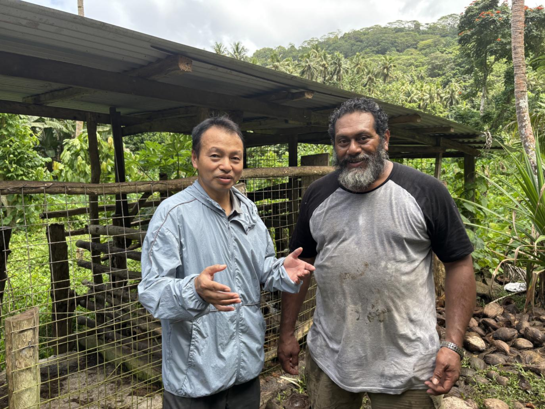 刚到萨摩亚的第5天,他便在萨方农渔业部官员陪同下,前往牛场开展小公牛阉割和母牛妊娠检查。面对当地人无绳无架直接放倒牛只保定的粗放方式,他现场指导搭建科学保定方法,教会他们给牛拴鼻圈,规避养殖风险。2025年10月17日,当地牧师Jerry驱车邀请他指导生猪养殖及人工授精技术。石忠诚结合当地热带植被丰富的特点,为其定制低成本养殖方案,从猪舍通风改造到疫病预防要点,每一项建议都贴合实际需求。这份真诚的帮扶换来了深厚情谊,Jerry不仅用新鲜椰子招待他们,还专门写下了感谢信。