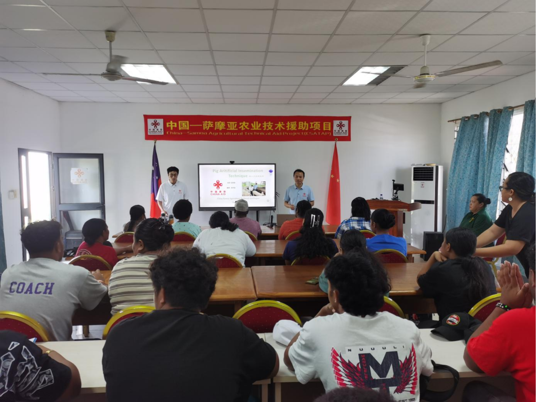 “课堂建在一线、技术送到田间”,这是石忠诚坚守的援助理念。针对萨摩亚养殖技术薄弱的现状,他精心搭建培训赋能平台,将中国技术毫无保留地传授给当地民众。2025年10月9日,他应邀赴南太平洋大学开展《猪人工授精技术》讲座,以“理论+案例”的生动形式,向当地师生系统讲解技术要点与应用价值。讲台上方“中国—萨摩亚农业技术援助项目”的横幅与中萨两国国旗交相辉映,让他深切感受到肩上的使命——传递技术之外,更要筑牢中萨友谊的纽带。