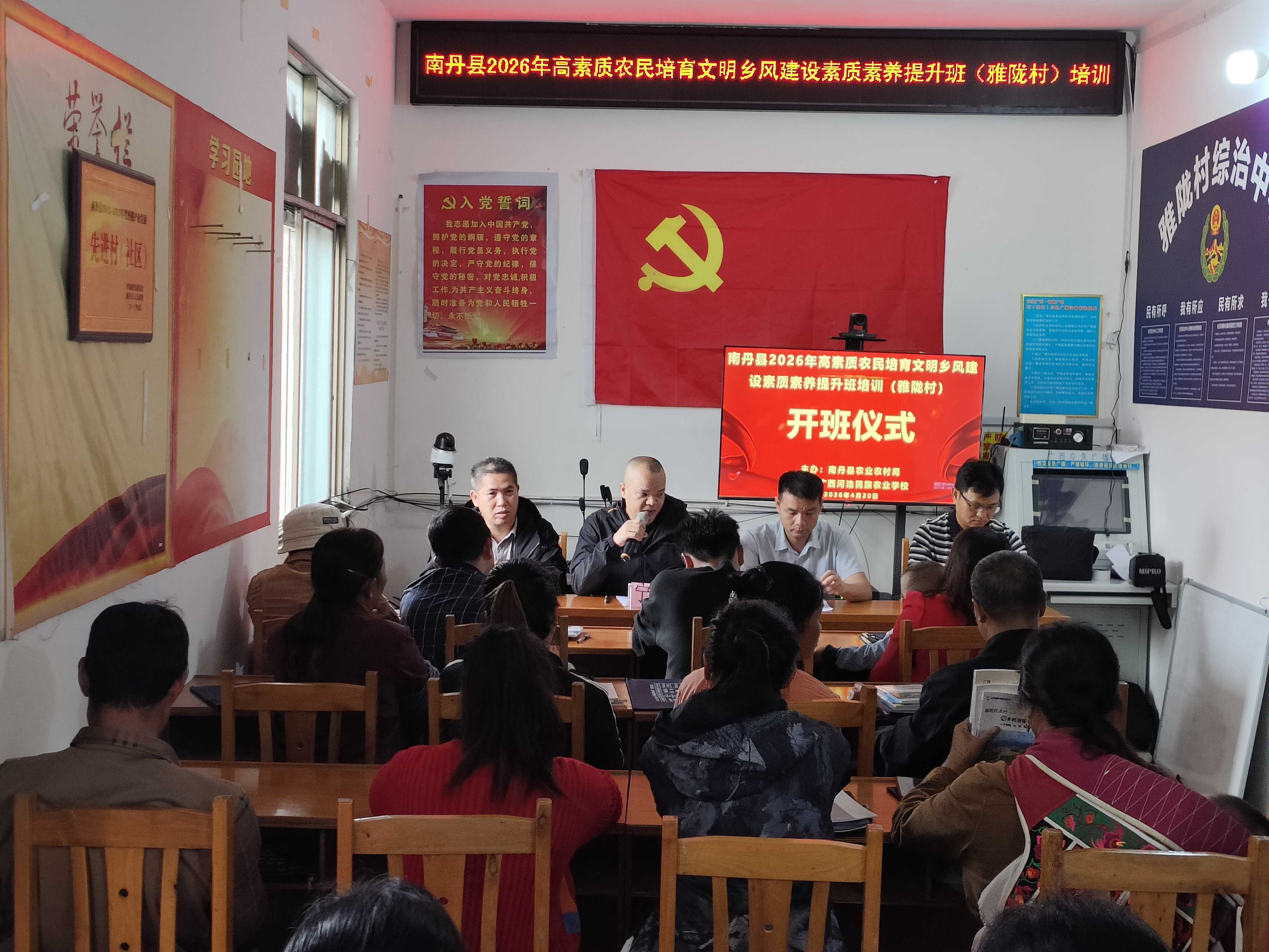 4月21日,南丹县2026年高素质农民培育文明乡风建设素质素养提升班在六寨镇雅陇村正式开班。本次培训班由南丹县农业农村局主办,委托广西河池民族农业学校(河池市民族农业学校)具体实施,为期9天,共有69名农民学员参加培训。