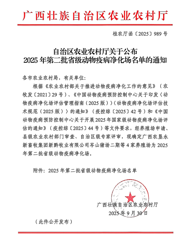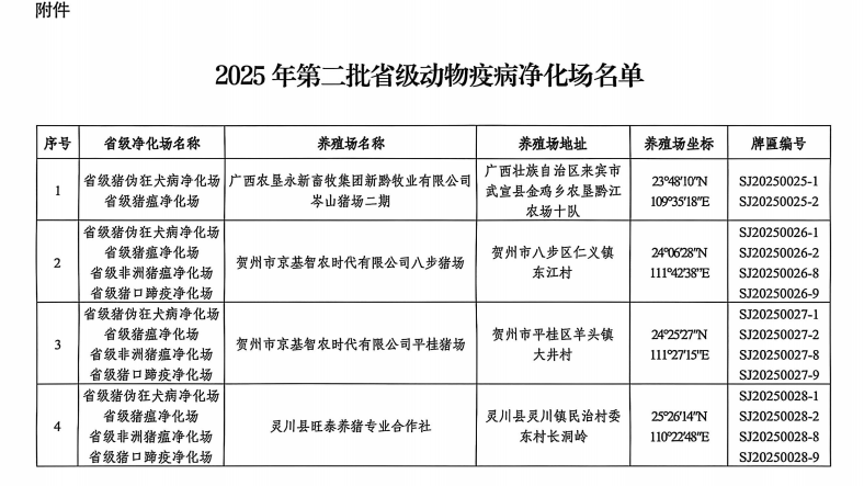 2025年9月30日,自治区农业农村厅将贺州市京基智农时代有限公司(八步场、平桂场)列为2025年第二批省级动物疫病净化场。创建动物疫病净化场可减少疫病隐患,改善防疫条件,提升防控水平,促进养殖业健康发展。