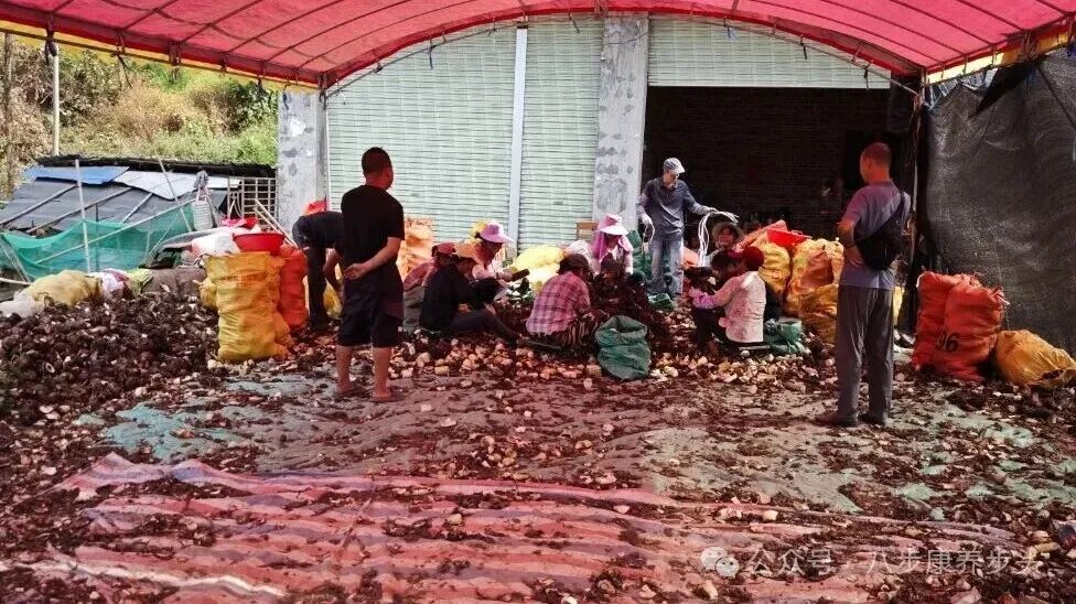 近日,在八步区步头镇梅中村卢屋寨香芋集中收购点,农户们正围着堆成小山似的芋头,忙着削毛、刨根去泥、筛选装袋,一派热火朝天的丰收景象。