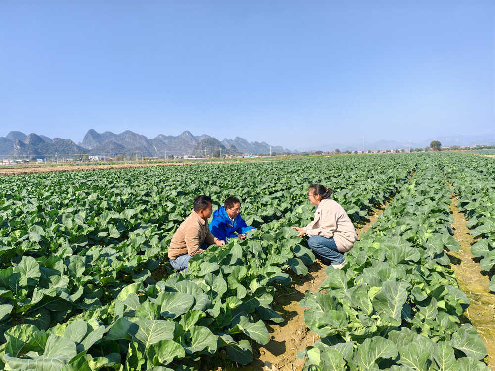 农技人员在钟山县回龙镇东寨村西兰花基地查看西兰花受霜冻影响情况