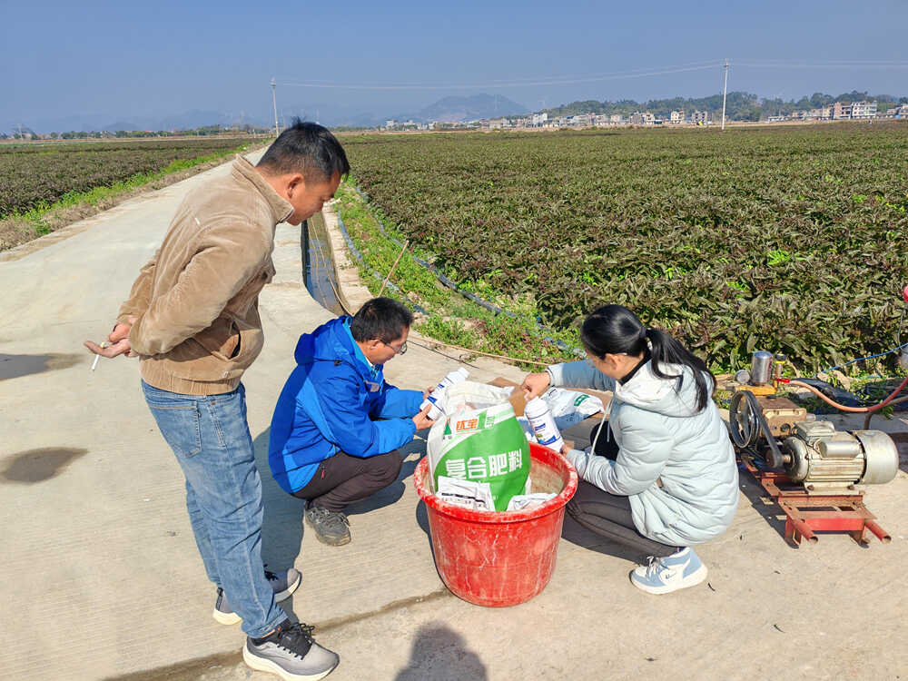 农技人员在钟山县回龙镇东寨村莴苣基地指导喷施叶面肥等防范霜冻危害