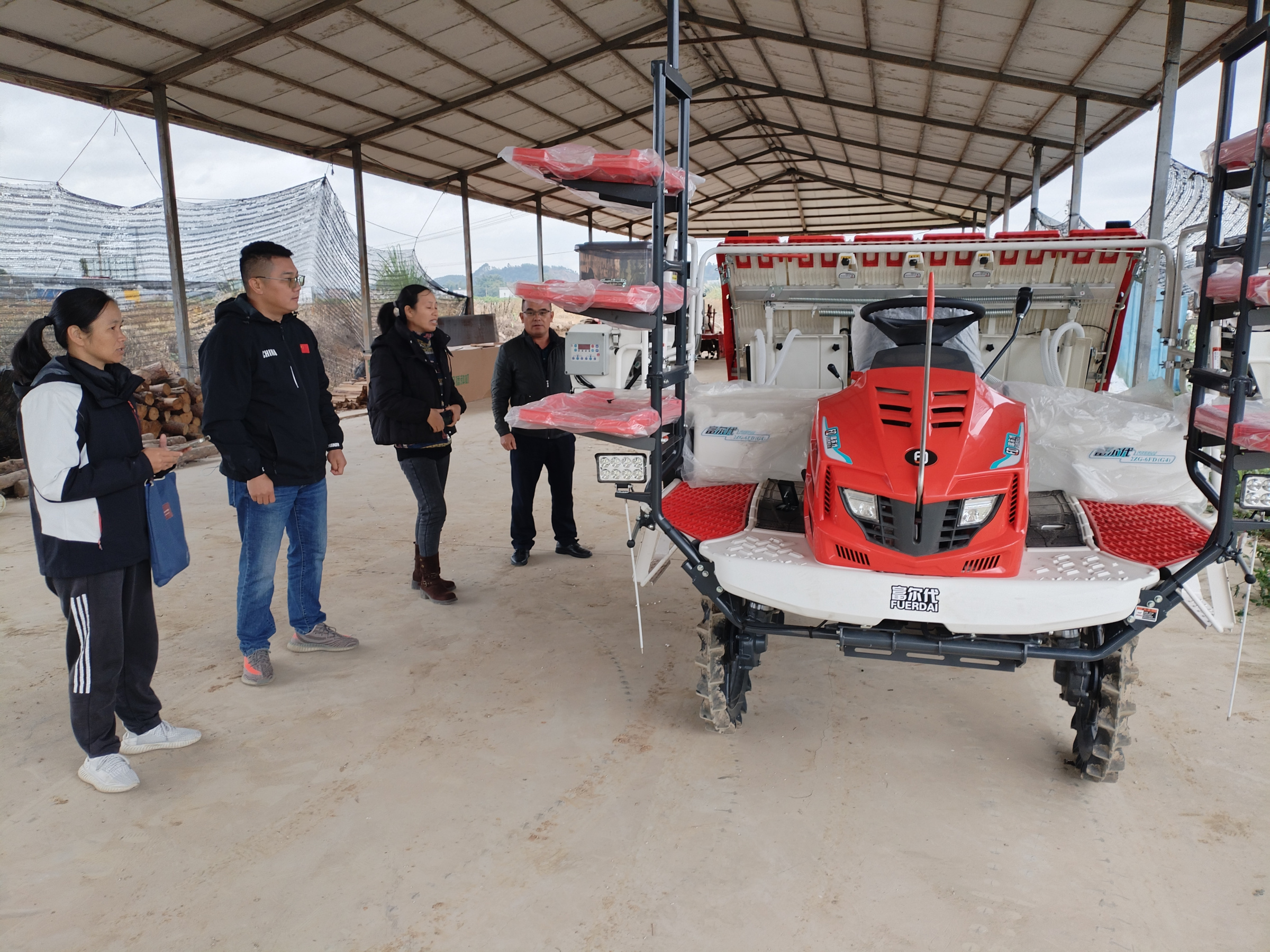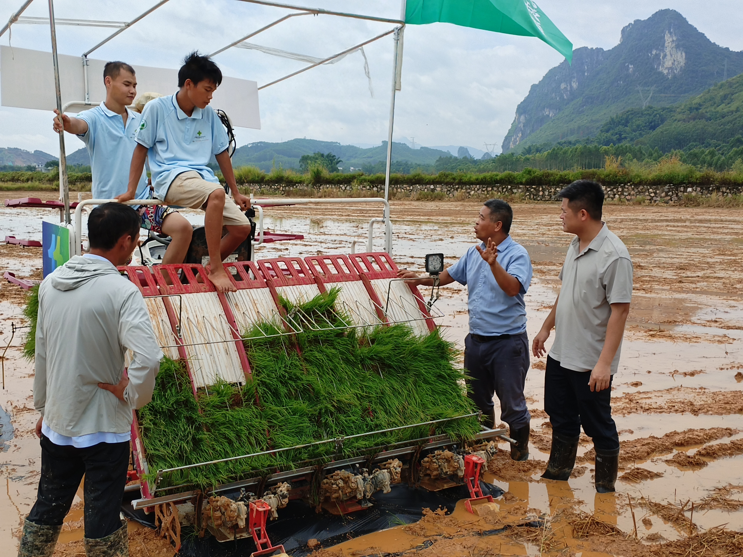 图为八步区农技推广人员向农机手传授插秧机操作使用要点,并推广农机农艺融合技术
