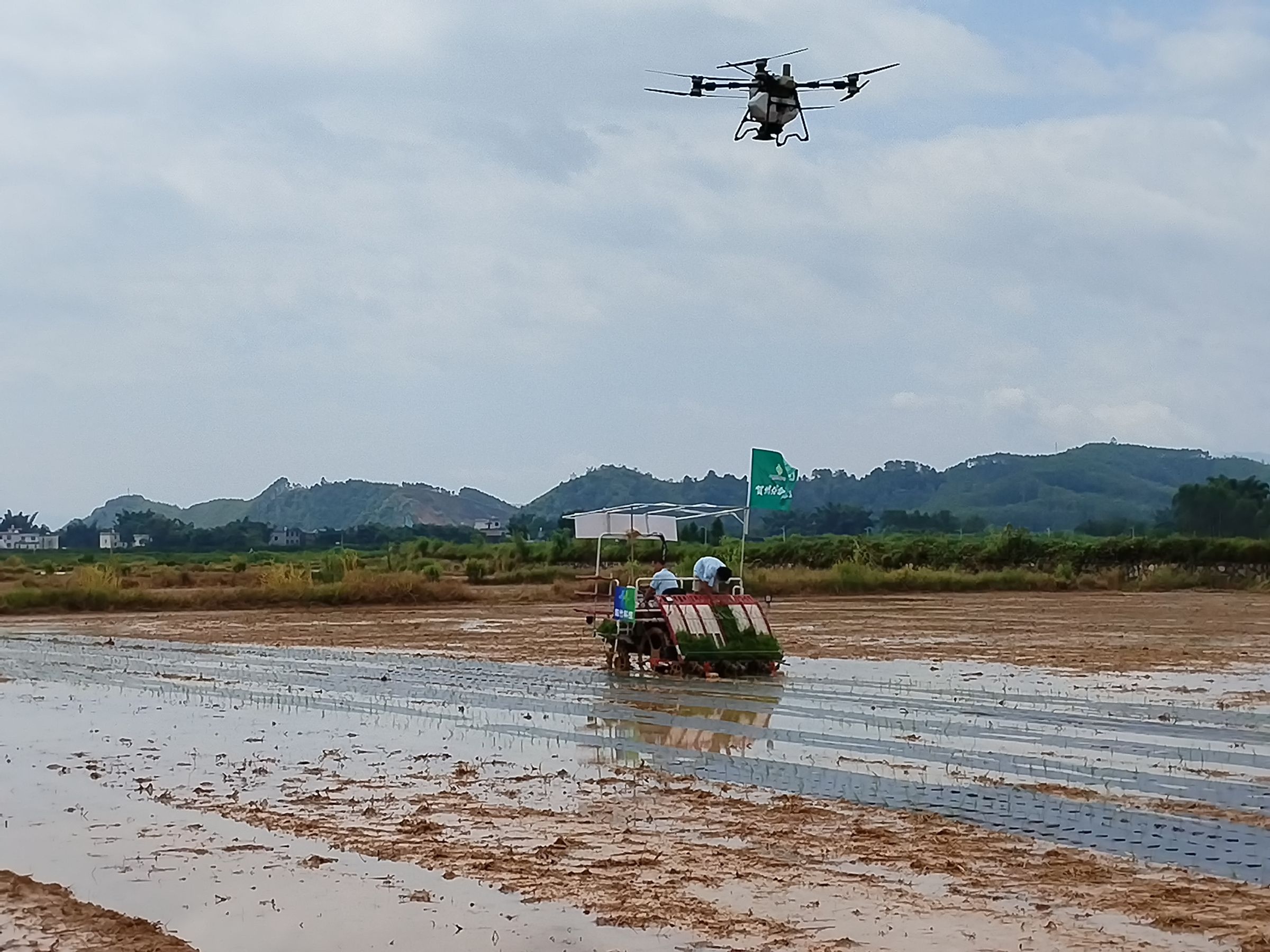图为植保无人机施肥和高速插秧机插秧同时作业