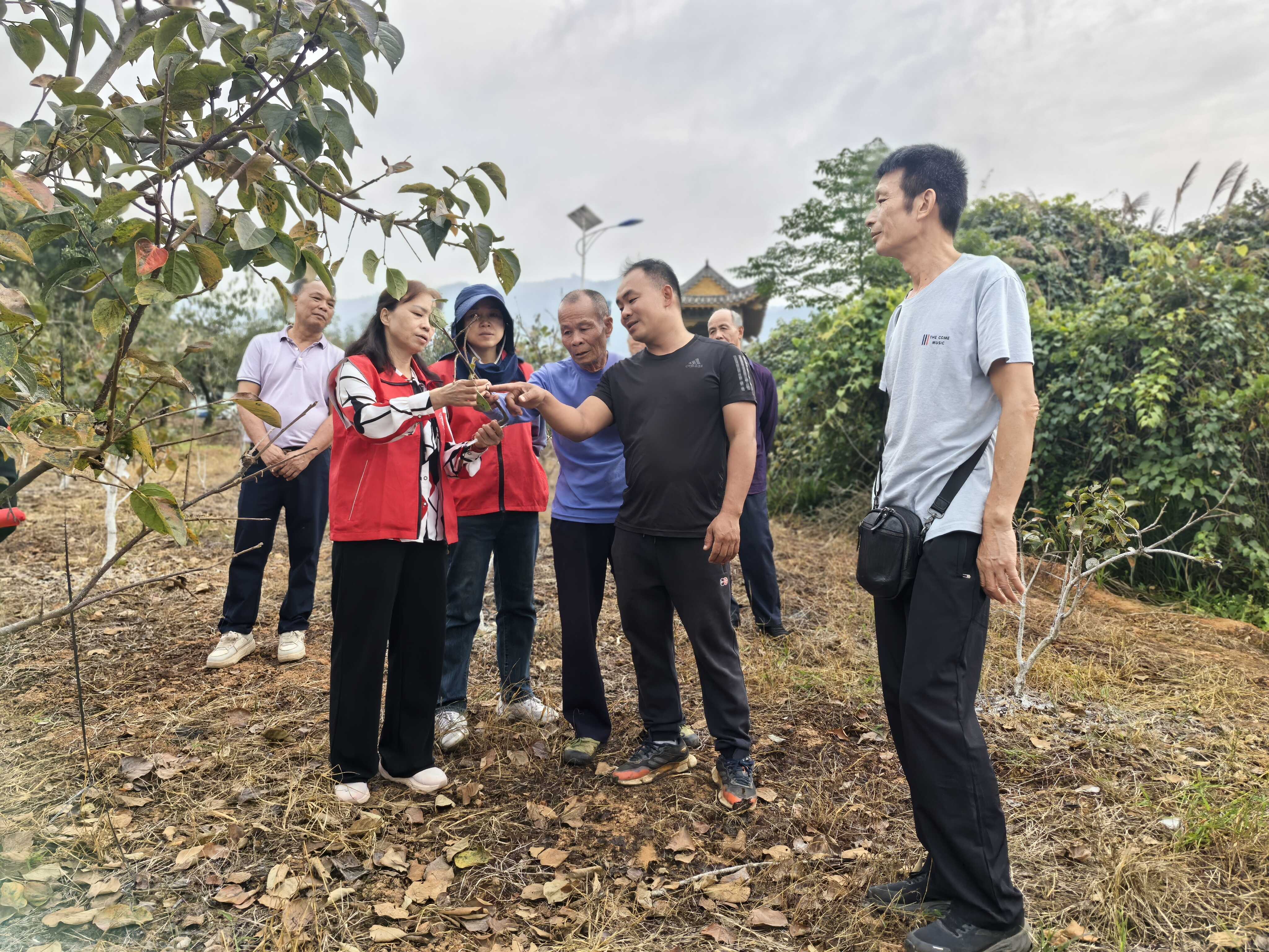 中午,乡村科技特派员们来到武宣县三里镇双龙村柿子果基地,首先由特派员朱桂宁在柿子果园现场开展“田间课堂”,向种植户对柿子果园进行全面指导,涵盖冬季消园、修剪枝条以及保花保果等技术工作。然后大家就今年的柿子生产情况与市场行情进行交流分析,规划明年的生产工作。