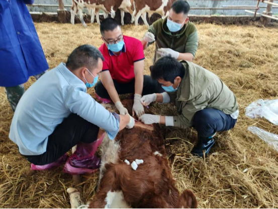 “多亏了兴宾区畜牧水产‘120’及时出诊、精准施救,帮我的牛场挽回了重大经济损失!”来宾市兴宾区双益种养专业合作社肉牛养殖场负责人罗明治感激说道。原来该牛场近期有一头牛犊连续5天出现腹部胀气、不食、不排泄等症状,生命处于危在旦夕,牛场技术员采取瘤胃放气、导泻、等治疗措施都没能治愈。12月20日(周六)早上,牛场负责人罗明治拨通了畜牧水产“120”服务热线求助,由高级畜牧专家罗伟宏站长带队赶赴现场,通过症状分析和现场诊断,初步诊断为毛团或塑料等导物堵塞引起的胀气。随即实施手术治疗,并取出一团约1公斤重的毛团,最终成功救治牛犊,目前牛犊状态良好,正在逐步康复中。