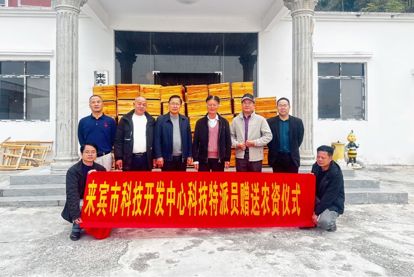 图为物资发放现场,来宾市科技开发中心赠送来宾市壮乡蜂业有限公司基地一批蜂箱。