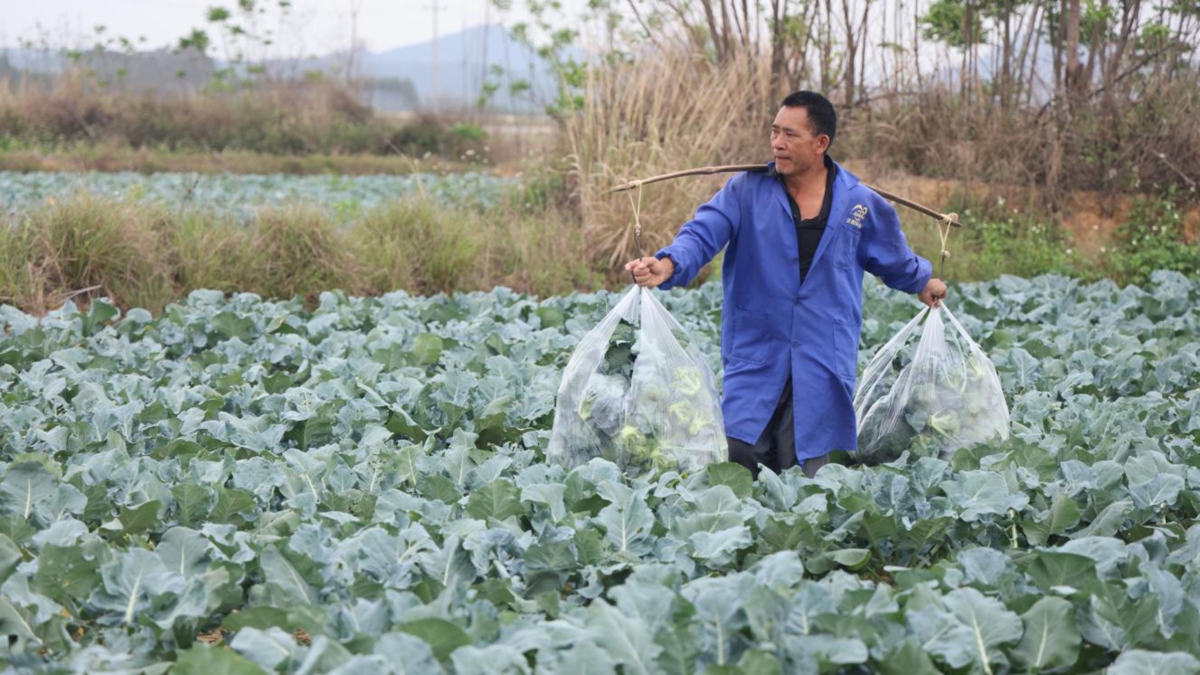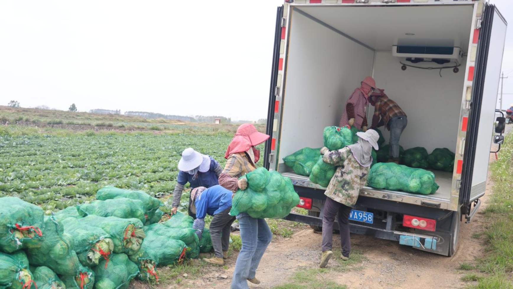 3月17日,在象州县石龙镇大塘村露天蔬菜种植基地里,翠绿的西兰花、包菜长势喜人,三十多名村民穿梭在菜地里,将饱满的菜球采收下来,装入口袋,整齐堆放在田埂。采摘结束后,再装上冷链车,发往市场。