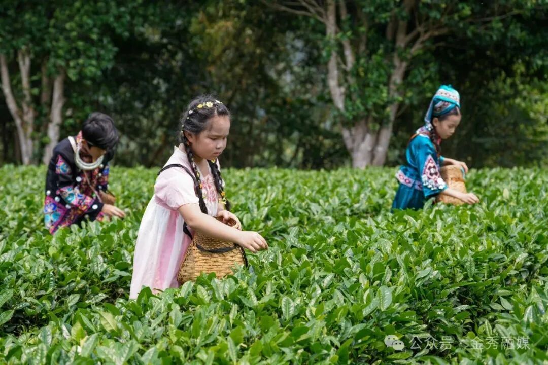 游客身着民族服饰走进茶园,大小朋友沉浸式体验采茶乐趣。金秀融媒 盘斌 摄