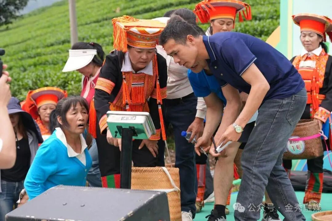活动现场,采茶比赛率先点燃氛围。来自各村屯的参赛队伍身着瑶族服饰,挎着茶篓,轻盈穿梭在翠绿茶垄间,指尖翻飞间,一片片符合标准的一芽一叶嫩芽被快速采入篓中,娴熟利落的动作,尽显当地群众精湛的采茶技艺与对茶产业的深厚情怀。
