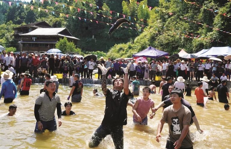 与此同时,村寨旁的小河里正在进行精彩的“闹鱼”活动。村民们已提前将鲜活的鱼儿放入河中,只见岸边的群众摩拳擦掌、跃跃欲试。随着主持人一声令下,“闹鱼”活动正式开始,大家纷纷跳入河中,或徒手抓鱼,或用渔网捕鱼,追逐活蹦乱跳的鱼儿,现场化作一片欢乐的海洋(见左图)。