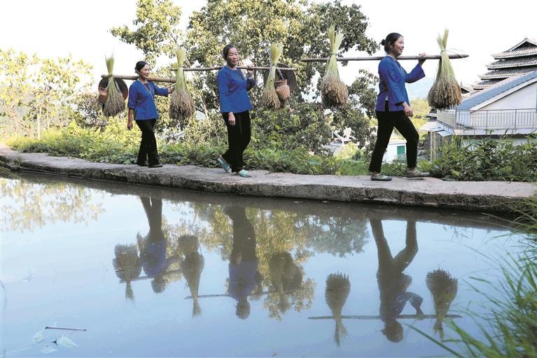 9月20日,八江镇归令村念马屯稻香鱼肥,村民们在田间剪禾、抓鱼,欢声笑语回荡山野。