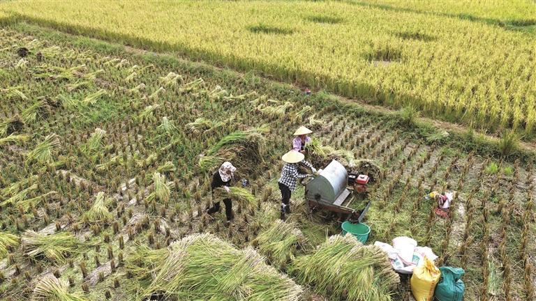 9月23日,三江侗族自治县丹洲镇西坡村的再生稻迎来收割期。村民们穿梭于稻浪间,抢抓农时收割稻谷。