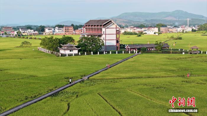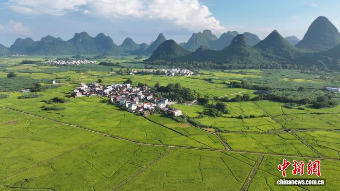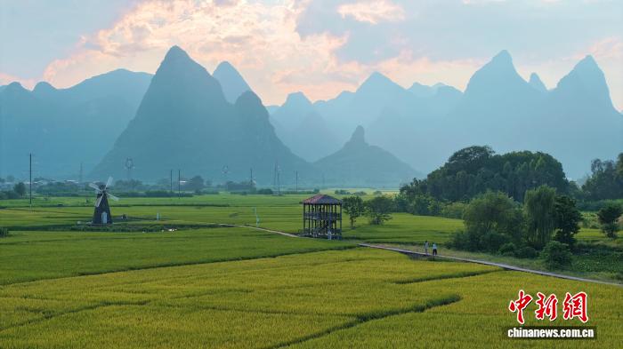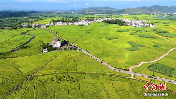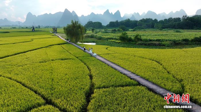 10月13日,在素有“桂北粮仓”美誉的广西柳州市柳城县古砦仫佬族乡,成片的稻谷逐步进入成熟期,与山脉、道路、村落构成一幅秀丽的田园画卷,吸引周边游客前来游玩。古砦仫佬族乡是全国唯一的仫佬族乡,当地以水稻产业为支撑,大力发展乡村旅游、生态度假、文化体验等,成为周边乡村休闲旅游的网红打卡地。图为游客在稻田中游玩。汤晓逵 摄