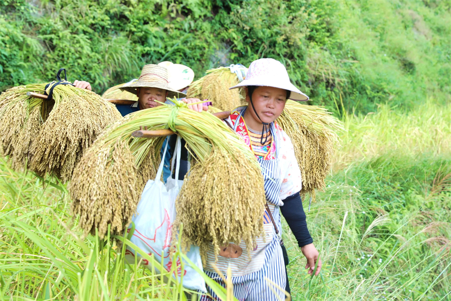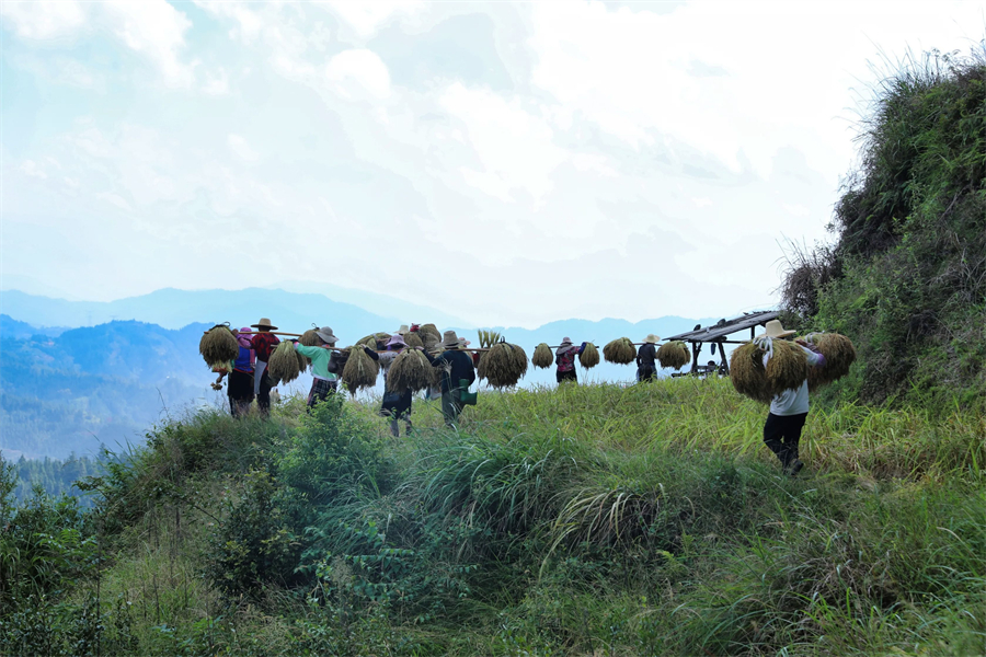 10月10日,三江侗族自治县富禄苗族乡大顺村村民抢抓晴好天气收获高山大糯,田间地头洋溢着丰收喜悦,现场一派忙碌景象。