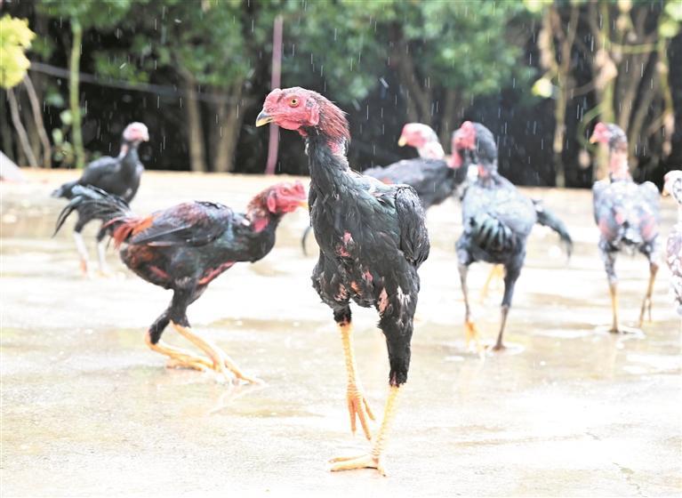 11月4日,蒙蒙细雨。记者来到凉亭村汶龙屯何仁武家,看见有10多只斗鸡站在房檐下躲雨。这些斗鸡与普通的家鸡有着很大的区别。斗鸡的鸡腿比较粗壮,身体结构匀称紧凑、壮实,鸡头呈鲜红色,羽毛鲜亮,头、颈高高昂起,使得颈、胸、胫几乎成一条直线。虽然下着雨,但当何仁武抓起一把玉米粒丢到家门口的空地上,这些斗鸡当即就冲出去啄食起来。