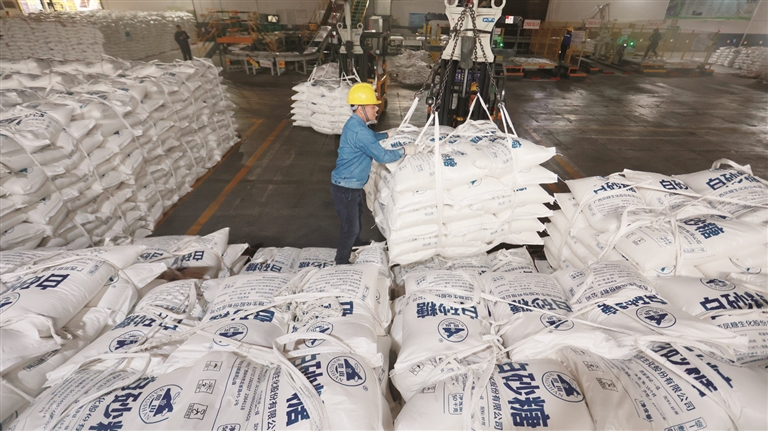 工人用设备搬运白砂糖。