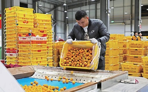 连日来,广西壮族自治区柳州市融安县的金橘迎来销售旺季。融安县果农与企业积极备货,线上线下同步发力,助力“甜蜜事业”再上新台阶。近年来,融安县始终将金橘产业作为强县富民的重要抓手,成功推动融安金橘产业从区域性“小特产”蝶变为产值近百亿元的大产业。2025年,融安金橘种植面积达23.1万亩,全产业链产值将近100亿元。图为广西融安爱田农业发展有限公司生产车间内,工作人员正在将金橘倒入自动选果机。