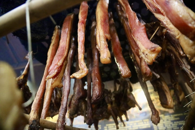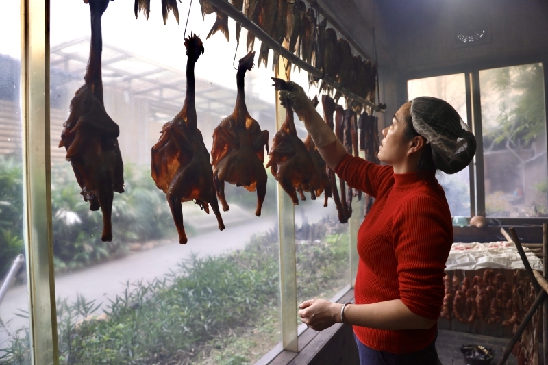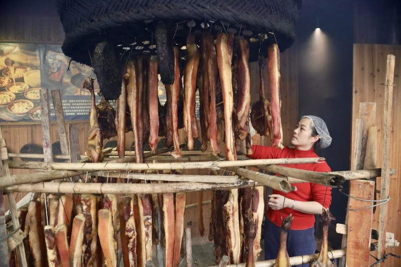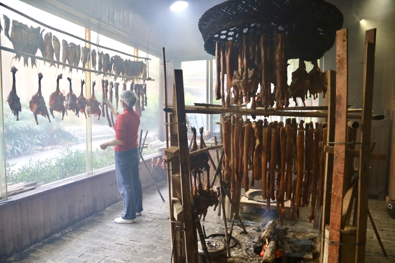 腌制好的本地土猪肉、土鸡悬挂在熏烤架上,以茶籽壳、甘蔗渣为燃料慢火熏烤,让腊味充分吸收香气,最终形成色泽褐红、肥瘦分明、腊香醇厚的独特风味。