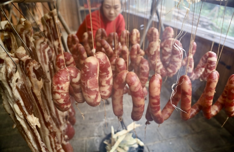 近日,在柳州市三江侗族自治县斗江镇盛龙民俗风情园,青烟袅袅,侗族群众正忙着烘烤腊肉、腊鸡、腊肠等侗家腊味,浓郁腊香漫溢园区,提前透出浓浓年味。
