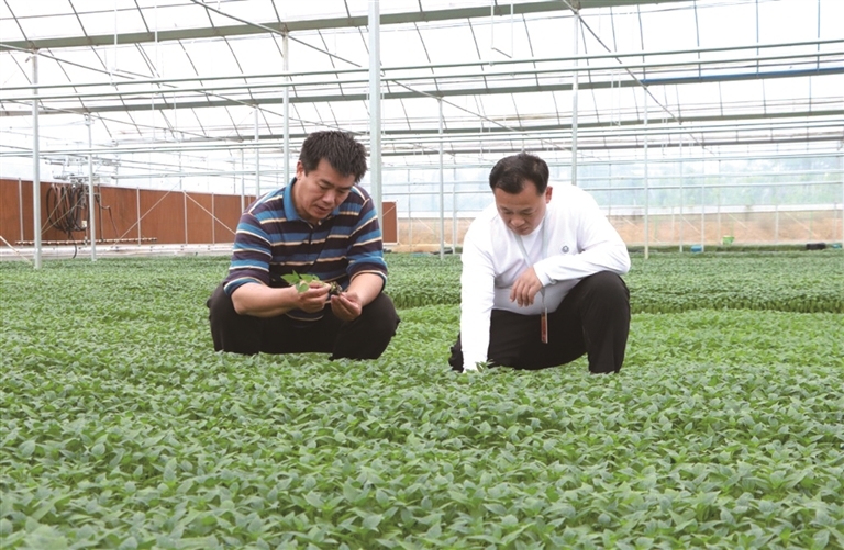 基地负责人仔细查看种苗生长情况。