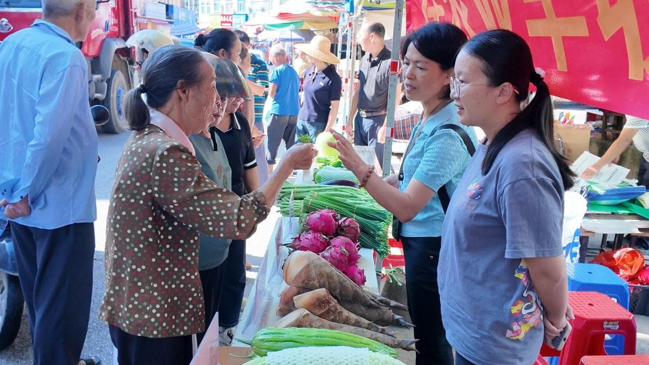 活动现场的农产品展区尤为吸睛,千里香、苦瓜、白玉甜笋、长寿菜等当地特色农产品琳琅满目,吸引不少群众驻足观赏、咨询采购,不时有村民拿起农产品询问产地、口感,现场互动氛围浓厚。农业技术服务专区人气高涨,各镇农业技术人员现场讲解各类农产品科学种植要点,结合当地种植实际,重点宣传特色蔬菜病虫害绿色防治方法等实用农技,指导村民辨别作物病害、选择合适农资。“以前种苦瓜总怕病虫害,今天听技术员一说,才知道提前打预防药这么关键!”五塘镇村民李大哥拿着农技手册认真记录,满脸收获。此外,工作人员还为村民免费发放灭蚁药、农业科普手册等农资及宣传品,贴心服务得到了群众的好评。
