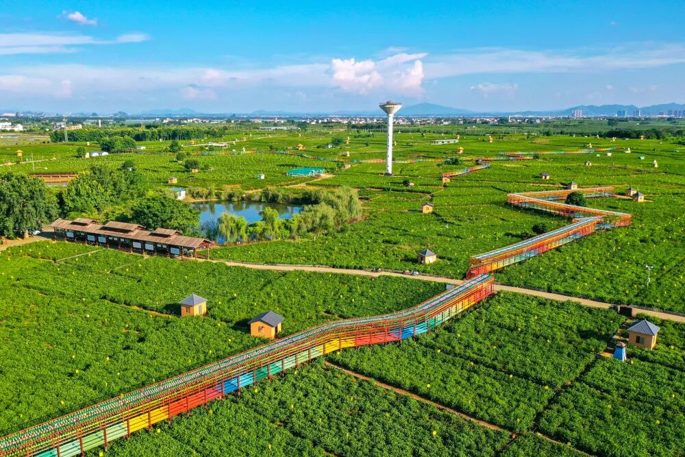 大大小小的茶园之中,中华茉莉园是欣赏茉莉花海景观的绝佳地方。极目望去,万亩花海,碧绿连天,朵朵洁白的茉莉花点缀于绿叶之中。游客们蹲在垄边细看,摘下几朵戴在头上,或采集鲜花,走到近旁歇脚的廊桥上,与当地姑娘一起体验制作茉莉花绣球、花环的乐趣。