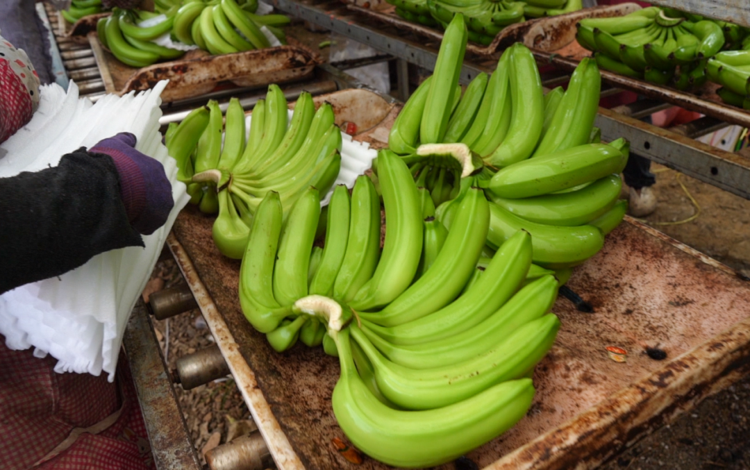 在田间地头正是一派热火朝天的丰收景象。割蕉、搬运、清洗、打包……工人们分工明确,配合默契。一条条索道载着“黄金果”在林中穿梭,将新鲜的香蕉送往装车点,繁忙而有序,处处洋溢丰收喜悦。